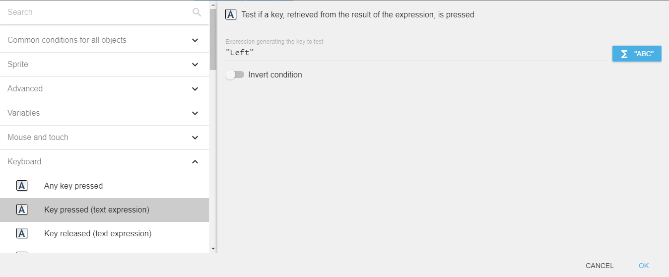 To test a key press using this condition, you need to enter the key name in the form of text expression. For example, if you want to check condition for left arrow key press, you need to enter "Left" in the field.